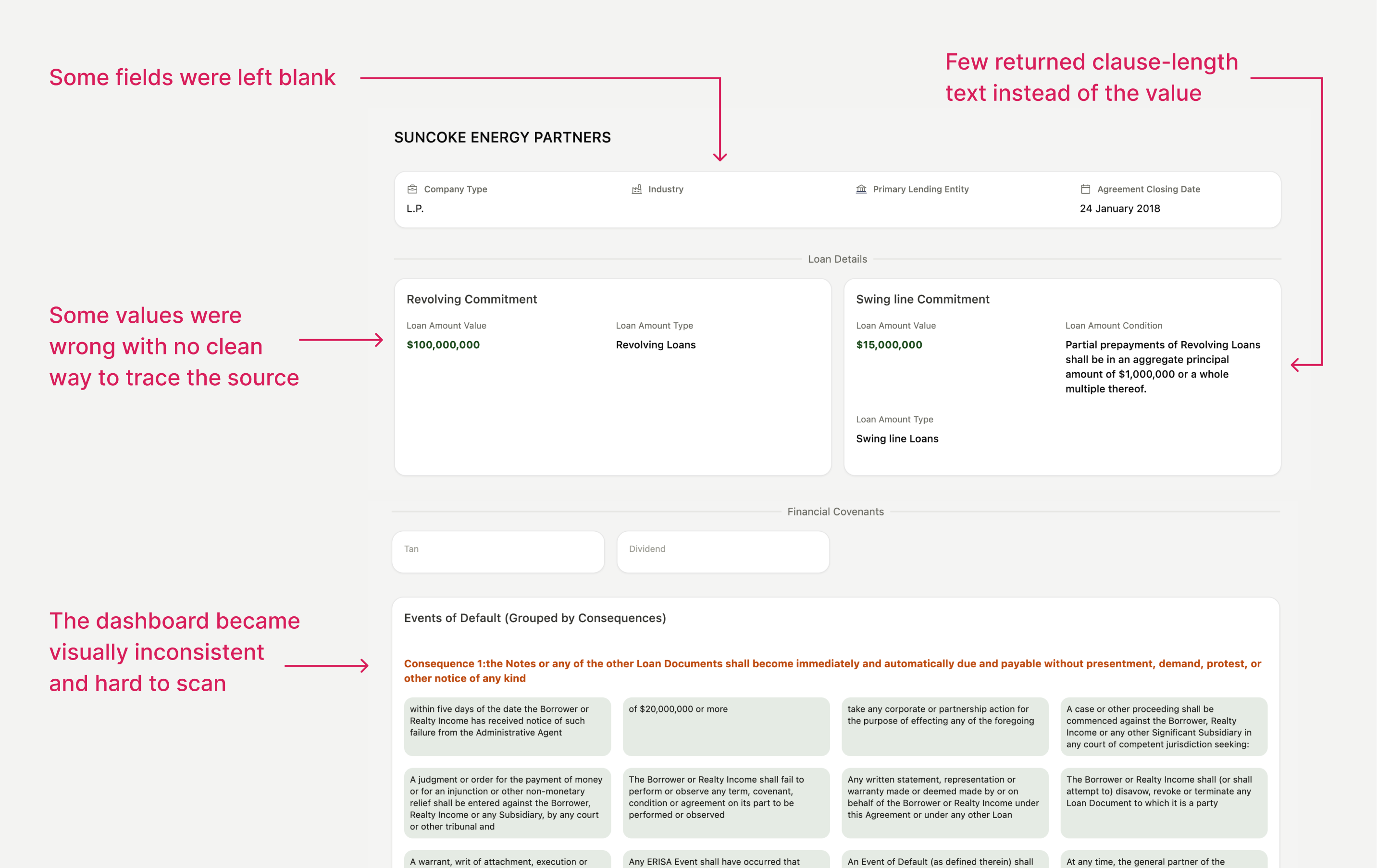 I built the extraction pipeline first to understand what GenAI could reliably extract from credit agreements, then designed the interface around those technical constraints rather than idealized mockups—enabling analysts to evaluate real, testable outputs.